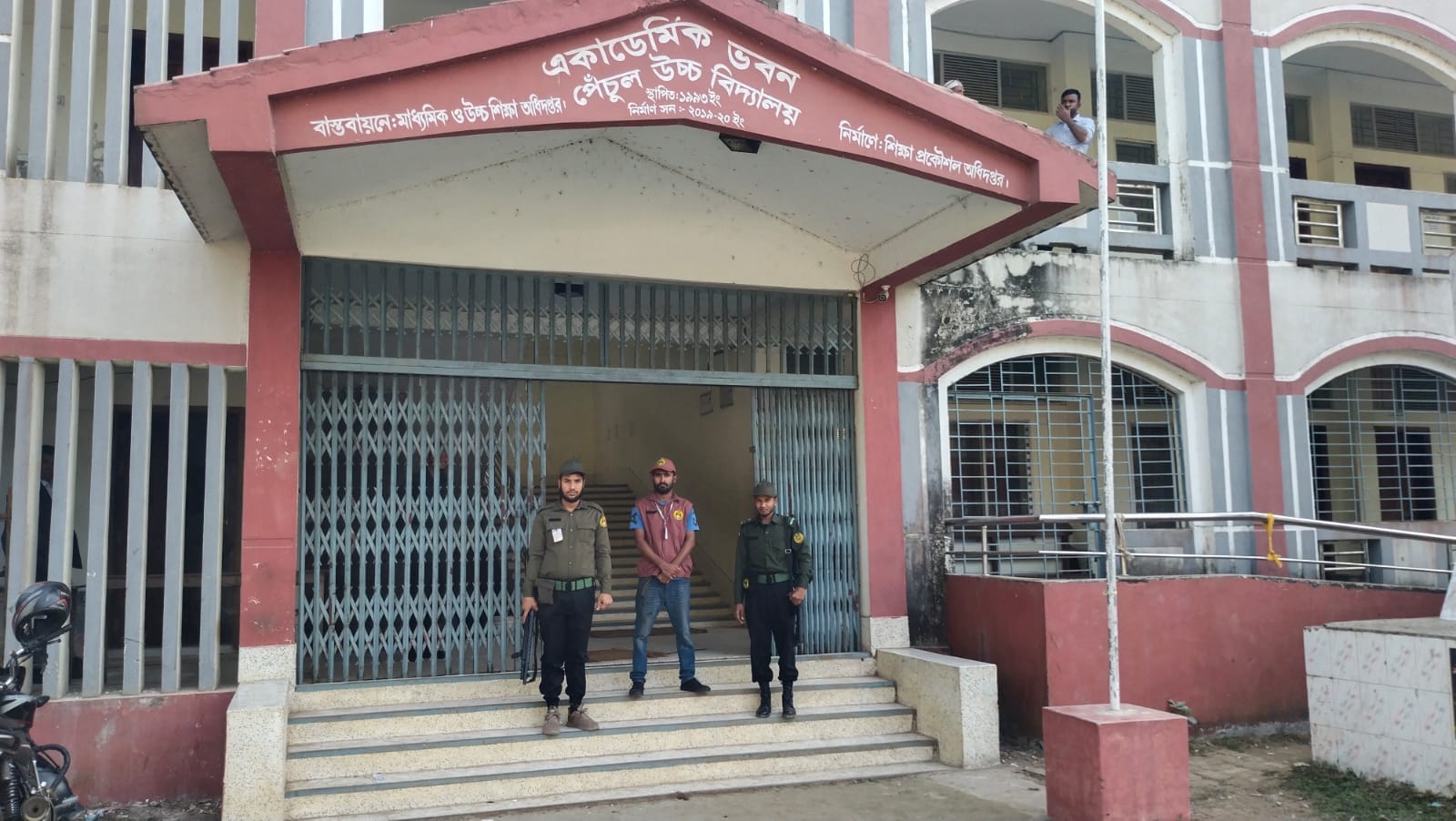 একই চিত্র পেচুল উচ্চ বিদ্যালয় কেন্দ্রেও। প্রধান ফটকের সামনে পুলিশের পাশাপাশি আনসার সদস্যরাও দায়িত্ব পালন করছেন। স্কুলের ভেতরে প্রিজাইডিং কর্মকর্তার কক্ষের সামনে বাড়তি পাহারা। কেন্দ্রটির দায়িত্বে থাকা উপজেলা ভেড়া উন্নয়ন খামারের ভেটেরিনারি সার্জন শাহিনুর রহমান জানান, এ কেন্দ্রে আটটি গ্রামের ৩ হাজার ৫৮৯ জন ভোটার রয়েছেন।