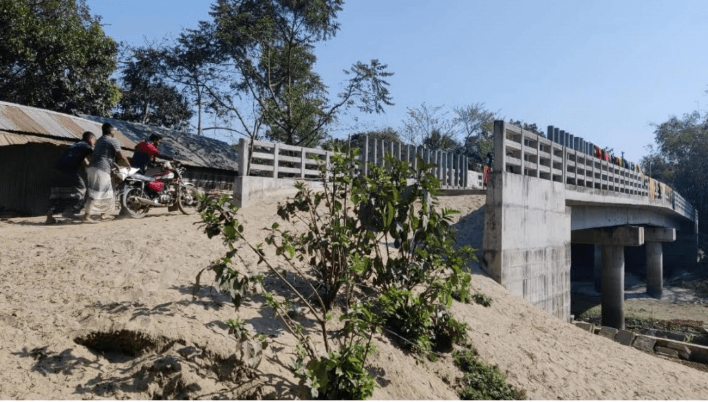সালে। সেতুর কাজ শেষ হয় ২০২১ সালের শেষের দিকে। স্থানীয় সূত্রে জানা গেছে, এই সেতুর দু’পাশে প্রায় ১০০ মিটার করে সংযোগ সড়ক নির্মান করা হবে। নির্মানযোগ্য সড়কের মোট ভূমির ৩৭ শতক জমি স্থানীয় ৭ ব্যক্তি মালিকের। এই জমি সংযোগ সড়কের জন্য অধিগ্রহণ করা হয়েছে। কিন্তু ভূমি মালিকেরা কয়েক দফা নোটিশ পেলেও আজ পর্যন্ত তাদের জমির মূল্য বুঝে পাননি। ফলে তাদের ব্যক্তিগত জায়গায় সেতুর সংযোগ সড়ক নির্মানে আপত্তি রয়েছে। মূলত এ কারণেই সেতু নির্মানের পর ৪ বছরেও দু’পাশে পাকা সংযোগ সড়ক নির্মান করা যায়নি।
