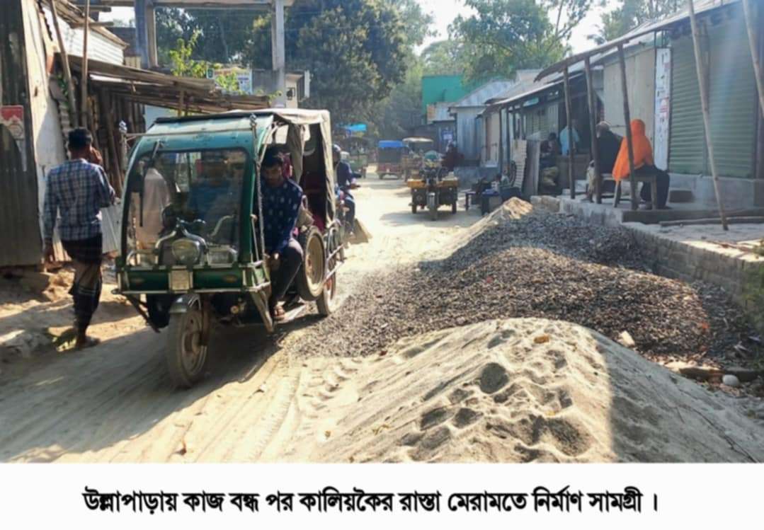 সিরাজগঞ্জের উল্লাপাড়ায় দহখুলা থেকে কালিয়াকৈর পর্যন্ত সাড়ে ৪ কিলোমিটার সাবমারজেবল রাস্তা পুনঃ মেরামত কাজ প্রায় ২ মাস ধরে বন্ধ থাকায় যানবাহন চলাচলে চরম ভোগান্তিতে পরেছে এলাকাবাসী । এ মেরামত কাজে ব্যবহারিত মালামাল রড, সিমেন্ট ও বালু পরীক্ষা না করেই ঢালাই এর কাজ শুরু করায় উপজেলা ইঞ্জিনিয়ার মেরামত কাজ বন্ধ করে দেয়। উপজেলার এলজিইডি অফিস থেকে জানা যায় উপজেলার মহোনপুর ইউনিয়নের মহোনপুর-কালিয়কৈর সাবমারজেবল রাস্তার দহখুলা হতে কালিয়াকৈর পর্যন্ত প্রায় সাড়ে ৪ কিলোমিটার রাস্তার পুনঃ মেরামত কাজের দরপত্রের মাধ্যমে কাজ পেয়েছে ঠিকাদারী প্রতিষ্ঠান মেসার্স কিংডম বিল্ডার্স । গত ২০২৪ সালের ডিসেম্বর মাসে কালিয়াকৈর থেকে