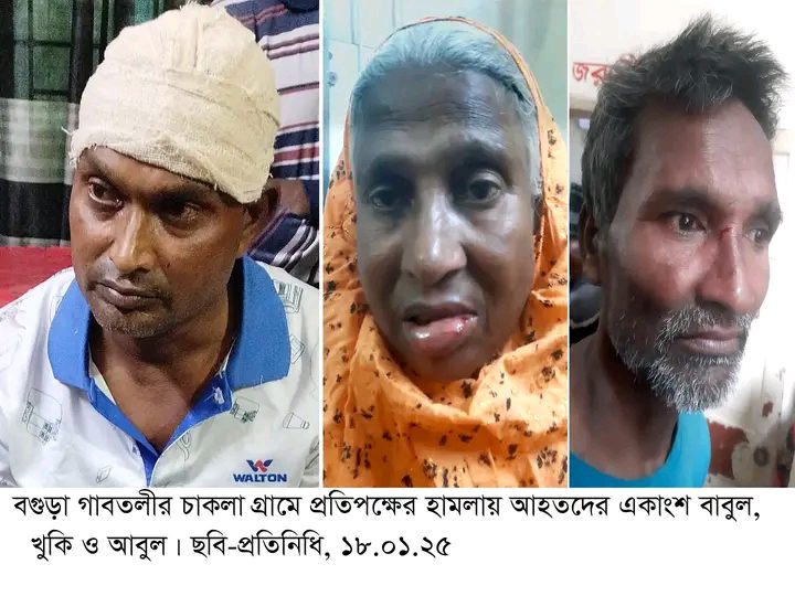 একাধিকসূত্রে জানা গেছে, গাবতলীর সুখানপুকুর ইউনিয়নের চামুরপাড়া গ্রামের মৃত অমেদ আলীর ছেলে সিএনজি চালক আব্দুল হান্নান (৪৫) প্রতিদিনের ন্যায় গতকাল শনিবার ভোরে সিএনজি নিয়ে বাড়ী হতে বের হয়। সকালে নাড়–য়ামালা আমতলা নামকস্থান হতে হান্নানকে সিএনজিসহ তাকে অপহরণ করা হয়। কে প্যানেল চেয়ারম্যান গোলজার ও তার লোকজন নাড়–য়ামালা হতে অপহরণ করে গ্রামের বাড়ী চাকলায় আটকে রেখে মোটা অংকের টাকা দাবী করে। এ ঘটনায় গতকাল সকালে হান্নানের ছোটভাই জিল্লুর রহমান (৩৩) গাবতলী মডেল থানায় একটি লিখিত অভিযোগ দায়ের করে। এদিকে অপহৃত হান্নানের পরিবারের লোকজন খবর পেয়ে হান্নানকে ছাড়িয়ে নিতে চাকলা গ্রামে গেলে প্যানেল চেয়ারম্যান গোলজার ও তার লোকজন বিভিন্ন ধারালো অস্ত্রসস্ত্রে সজ্জিত হয়ে অতর্কিতভাবে হামলা চালিয়ে একই পরিবারের ৬জনকে কুপিয়ে জখম করে এবং নগদ দেড় লাখ টাকা ও ১টি মোবাইল ফোন ছিনিয়ে নেয়। আহতরা হলো, বাবুল আকন্দ (৪৫), খুকি বেগম (৭০), আবুল আকন্দ (৫৫), বিউটি বেগম (৪০), আ: হান্নান (৪০) এবং পান্না (৩৮)। আহতদের মধ্যে বাবুল ও খুকিকে আশংকাজনক অবস্থায় বগুড়া শজিমেক হাসপাতালে ভর্তি করানো হয়েছে। বাবুলের আঘাতপ্রাপ্ত মাথায় ১৫টি সেলাই দিতে হয়েছে।