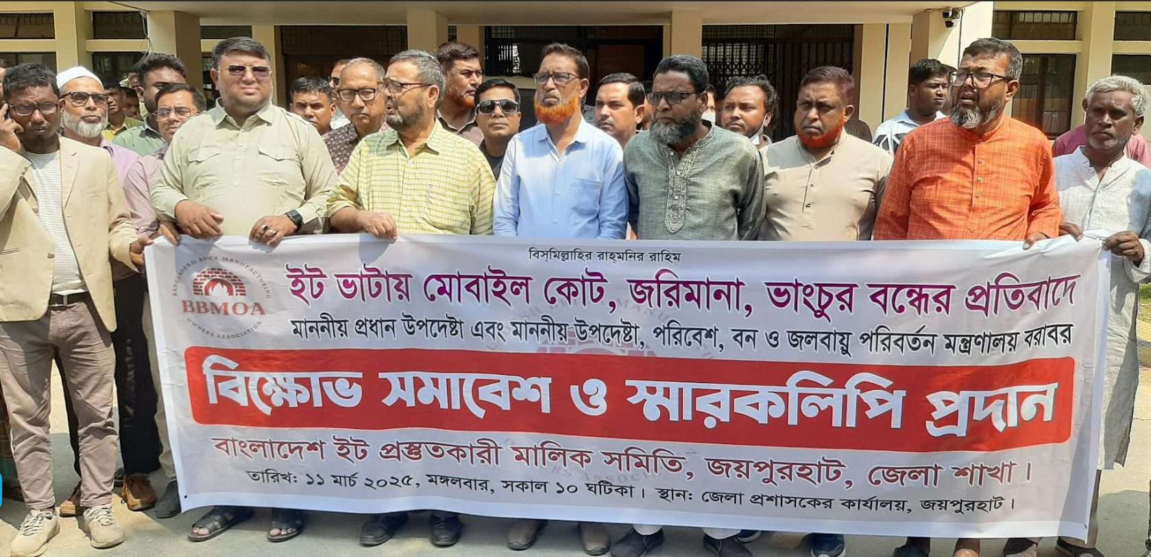 জয়পুরহাট জেলা প্রতিনিধিঃ- ১১ মার্চ, ২৫ জয়পুরহাটসহ সারাদেশে ইট ভাটায় প্রশাসনের মোবাইল কোর্ট জরিমানা ভাংচুরের প্রতিবাদে বিক্ষোভ সমাবেশ করেছে বাংলাদেশ ইট প্রস্তুতকারী মালিক সমিতির জয়পুরহাট জেলা শাখার নেতৃবৃন্দরা।মঙ্গলবার সকালে ডিসি অফিসের সামনে বিক্ষোভ সমাবেশ অনুষ্ঠিত হয়।