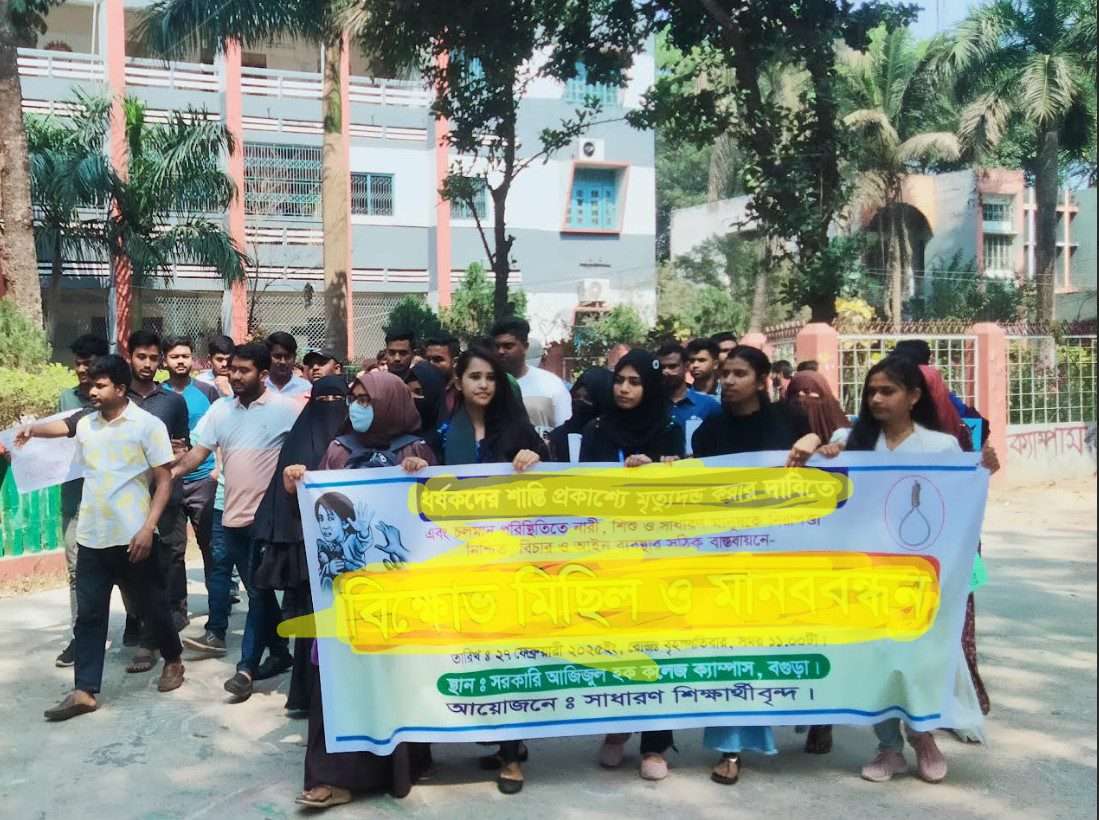 ধর্ষকদের শাস্তি মৃত্যুদন্ড করার দাবিতে এবং চলমান পরিস্থিতিতে নারী, শিশু ও সাধারণ মানুষ্র নিরাপত্তা নিশ্চিত, বিচার ও আইন ব্যবস্থার সঠিক বাস্তবায়নের দাবিতে আজ সকাল সাড়ে ১১ টায় সরকারি আজিজুল হক কলেজ ক্যাম্পাসে সাধারণ শিক্ষার্থীদের বিক্ষোভ মিছিল ও সমাবেশ অনুষ্ঠিত হয়েছে।