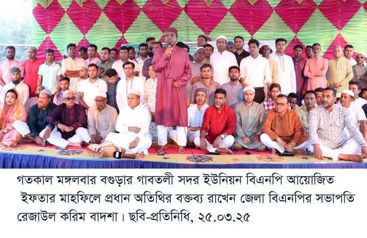 ২৫মার্চ মঙ্গলবার বগুড়া গাবতলীর সদর ইউনিয়ন বিএনপি ও অঙ্গদলের উদ্যোগে খালেদা জিয়া, তারেক রহমানসহ জিয়া পরিবারের জন্য দাঁড়াইল বাজার জিয়া অরফানেজ ট্রাষ্ট মাঠে দোয়া ও ইফতার মাহফিলে প্রধান অতিথির বক্তব্যে তিনি উপরোক্ত কথাগুলো বলেন। এতে বিশেষ অতিথির বক্তব্য রাখেন জেলা বিএনপি সহ-সভাপতি ও উপজেলা বিএনপির সভাপতি মোরশেদ মিল্টন। আমন্ত্রিত অতিথির বক্তব্য রাখেন জেলা উপজেলা বিএনপির সাধারণ সম্পাদক এনামুল হক নতুন, সাংগঠনিক সম্পাদক মমিনুল হাসান মমিন ও সাহাদত হোসেন সাগর। উপজেলা বিএনপির সহ-সভাপতি মকবুল হোসেনের সভাপতিত্বে এবং উপজেলা যুবদলের যুগ্ম আহŸায়ক মিনহাজুল ইসলামের পরিচালনায় এতে বক্তব্য রাখেন উপজেলা বিএনপির সহ-সভাপতি প্রভাষক আশরাফ হোসেন, উপজেলা বিএনপির যুগ্ম সাধারণ সম্পাদক মুঞ্জুর মোরশেদ, সুরাইয়া জেরিন রনি, পৌর বিএনপির যুগ্ম সাধারণ সম্পাদক হারুনুর রশীদ হারুন, সহ-সাধারণ সম্পাদক আ: গফুর টুকু, মোরশেদ আলামিন লিমন, প্রচার সম্পাদক এমআর ইসলাম রিপন, উপজেলা যুবদলের সিনিয়র যুগ্ম আহŸায়ক রুহুল হাসান রুহিন, যুগ্ম আহবায়ক মশিউর রহমান সুমন, উপজেলা স্বেচ্ছাসেবকদলের আহবায়ক রাকিবুল হাসান হিরু, উপজেলা তাঁতীদলের সভাপতি রাশেদুর রহমান রাঙ্গা, পৌর যুবদলের যুগ্ম আহবায়ক সোহেল রানা, পৌর ছাত্রদলের সভাপতি জাকিরুল ইসলাম লুকু, যুবদল নেতা আশরাফুল হুদা টপি, নুর হোসেন, রাফিক হাসান, হযরত আলী, রনি আহম্মেদ, শিপন মিয়া, সুমন, শ্রমিক দলনেতা মিনারুল প্রমুখ।