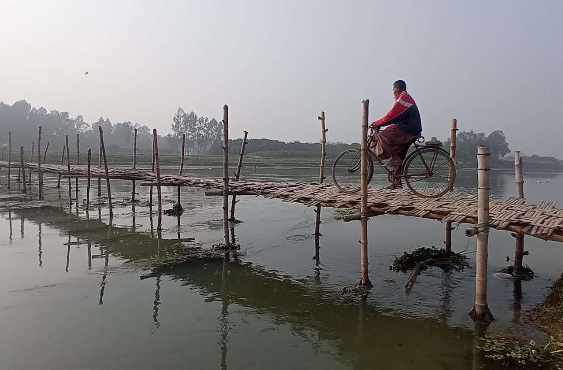 বদরগঞ্জ রংপুর প্রতিনিধিঃ- স্বাধীনতার ৫৪ বছরেও হয়নি সেতু নির্মাণ। ভোট আসলে প্রতিশ্রুতি দেওয়া হয় সেতু নির্মাণের।আজও কথা রাখেনি কেউ। রংপুরের বদরগঞ্জ উপজেলার মধুপুর ইউনিয়ন বদরগঞ্জ পৌরশহরের অংশে নির্মাণ হয়নি একটি ব্রিজ।ফলে ইউনিয়নের হাজারো মানুষের পারাপার বর্ষায় ভরসা নৌকা'নদীতে পানি কমে গেলে ভরসা তাদের বাঁশের সাঁকো। দেশ স্বাধীনের ৫৪ বছর পেরিয়ে গেলেও কোনও সরকারের আমলে নজরে আসেনি ওই স্থানে সেতুর নির্মাণের বিষয়টি।মিলেছে শুধু গালভরা প্রতিশ্রুতি এলাকাবাসীর দাবি পুরন না হলেও একদিকে বছরের পর বছর নদী থেকে বালু উত্তোলন করে ফায়দা লুটছে একটি প্রভাবশালী চক্র,অন্যদিকে বর্ষায় নৌকা আর শুকনোয় বাঁশের সাঁকো দিয়ে ইজারাদারের হয়েছে পোয়াবারো।