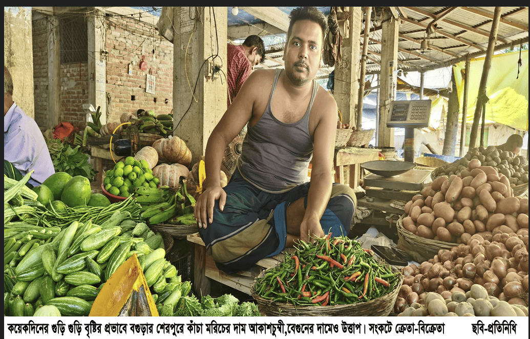 শনিবার (১২ জুলাই) শেরপুর পৌরসভার বৈকাল বাজার ও বগুড়ার বিভিন্ন কাঁচাবাজার ঘুরে দেখা গেছে, বৃষ্টির কারণে মরিচের গাছপালা নষ্ট হওয়ায় বাজারে সবজির সরবরাহ কমেছে। এর প্রভাব পড়েছে সরাসরি দামে।