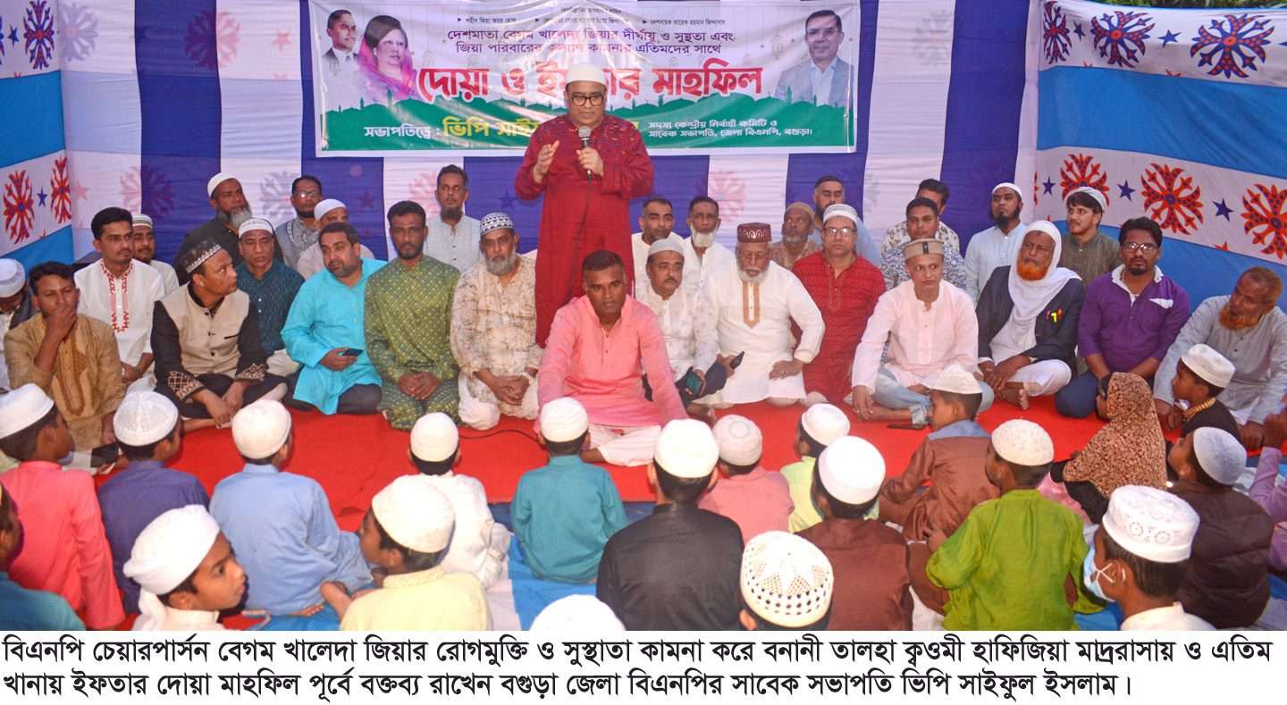 সাবেক প্রধানমন্ত্রী বেগম খালেদা জিয়াকে মিথ্যা মামলা দিয়ে কারাগারে আটকে রেখে মৃত্যুর দিকে ঠেলে দিয়েছিল। বিএনপির ভারপ্রাপ্ত চেয়ারম্যান তারেক রহমান বাংলাদেশ গড়ার জন্য ৩১ দফার কর্মসূচি দিয়েছেন। ৩১ দফা কর্মসূচি বাস্তবায়ন হলে বাংলাদেশের সকল মানুষের দাবি-দাওয়া পূরণ হবে। বেগম খালেদা জিয়া অসুস্থ, তিনি চিকিৎসার জন্য দেশের বাইরে আছেন তার জন্য দোয়া করবেন তিনি যেন সুস্থ হয়ে আবার দেশে ফিরতে পারেন। বিএনপি চেয়ারপার্সন বেগম খালেদা জিয়ার রোগমুক্তি ও সুস্থাতা কামনা করে বগুড়া শহরের ১৩নং ওয়ার্ডের বনানী তালহা ক্বওমী হাফিজিয়া মাদ্ররাসায় ও এতিম খানায় ইফতার দোয়া মাহফিল পূর্বে উপরোক্ত কথাগুলো বলেন।